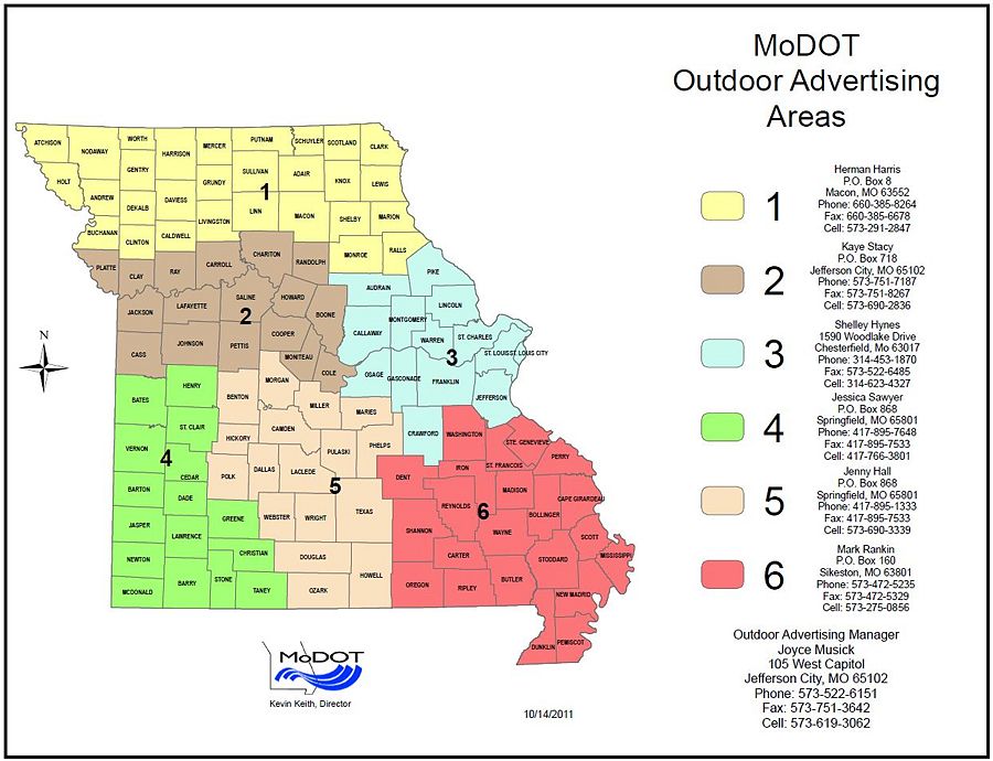 Outdoor Advertising (ODA)’s Central Office is located in Jefferson City, Missouri with seven (7) area specialists and three (3) technicians located around the state to best serve our customers. Activities outlined in the following portions of this article and in EPG 236.17 Junkyards shall be undertaken by each area office.