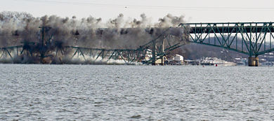 Rte. 5 over the new Hurricane Deck Bridge near Sunrise Beach was completely closed for about 15 minutes in both directions as MoDOT Commissioner Gregg Smith gets the honor to blast around one million pounds and 740 ft. of the old bridge into the Lake of the Ozarks. Duane Houkom, Inc. was the subcontractor for the blast. The bridge opened in 1936 and was closed on Sept. 9, 2013. Two more spans to go.